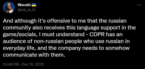То же самое касается и русскоязычных каналов, которые до сих пор активны. Как справедливо отмечает интернет-пользователь, «у CDPR есть аудитория не из России, которая ежедневно использует этот язык, и компании приходится как-то с ней общаться».