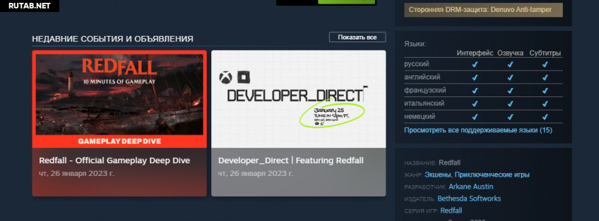 Как ожидается, Redfall получит антипиратскую защиту Denuvo, а также будет полностью переведена на русский язык, однако в российском Steam игра на данный момент недоступна.