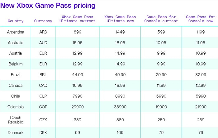 Так, в США месяц Xbox Game Pass Ultimate подорожает с $15 до $17, а Xbox Game Pass — с $10 до $11. Портал The Verge также подготовил сводную таблицу с изменением цен на Game Pass в различных странах (ниже).