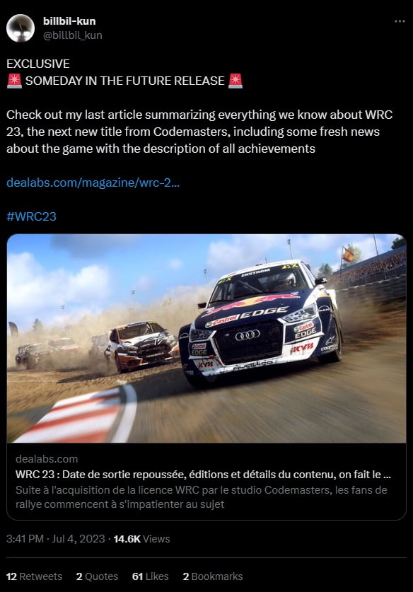 WRC 23 станет первой частью этой серии раллийных симуляторов, разработанных студией Codemasters, которая известна по серии DiRT. Хотя официальной информации об игре не так много, в прошлом в сети ходили достоверные слухи о проекте. Одним из них была потенциальная дата релиза, которая, видимо, уже устарела.