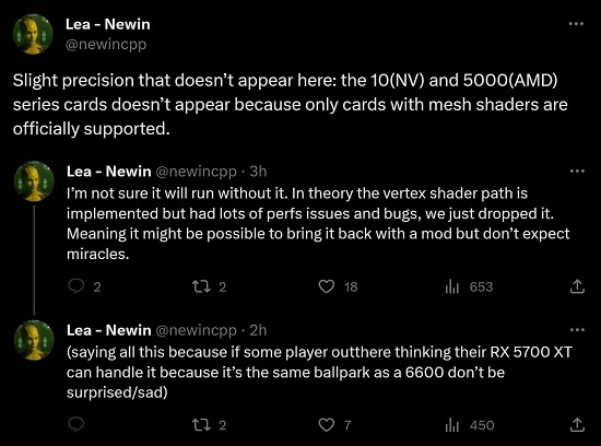 Как объяснил (позднее твиты были удалены) у себя в микроблоге один из сотрудников Remedy, игре для работы нужна технология Mesh Shaders, а более старые видеокарты (GTX 10-й и RX 5000-й серий) её не поддерживают.