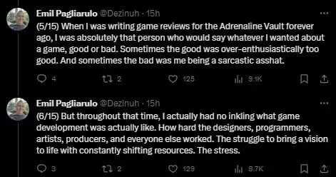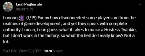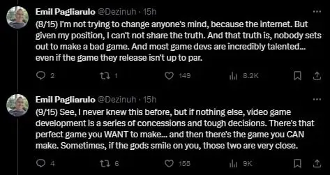 Эмиль Пальяруло (директор по дизайну Bethesda) выступил в защиту создателей игр в обширном посте на X. И хотя название Starfield ни разу не упоминается в серии записей, нетрудно догадаться, что именно последняя работа Bethesda и ее прохладный прием подтолкнули создателя к такой реакции.