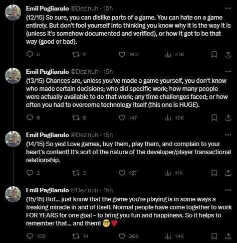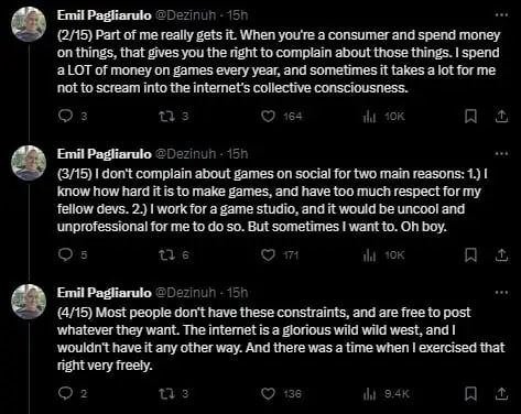 В последующих записях разработчик понижает градус накала и ставит себя на место игроков, которые тратят свои деньги на продукцию и ожидают, что она того стоит. Пальяруло рассказал, что ему самому часто хотелось раскритиковать игры, но он этого не делал, потому что знает, как они создаются, и очень уважает других создателей.