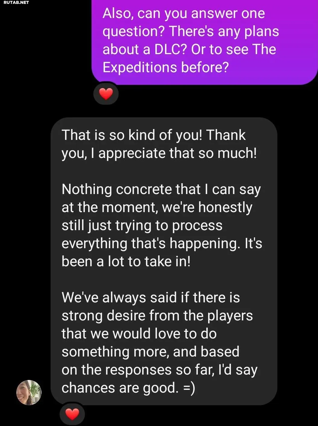 В ответ на вопросы фанатов Сведберг-Йен отметила: «Пока нет официального подтверждения разработки DLC, но если игроки проявят большой интерес, мы с радостью возьмёмся за его создание. Учитывая отзывы, вероятность этого высока».