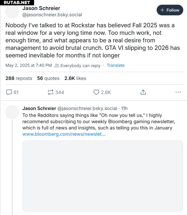 «Сотрудники Rockstar, с которыми я общался, давно считали осень 2025 года нереалистичным сроком. Объём работы слишком велик, времени недостаточно, а руководство, похоже, действительно хочет избежать crunch (переработок). Перенос „GTA 6“ на 2026 год казался неизбежным ещё несколько месяцев назад, если не раньше», — написал журналист в Bluesky.