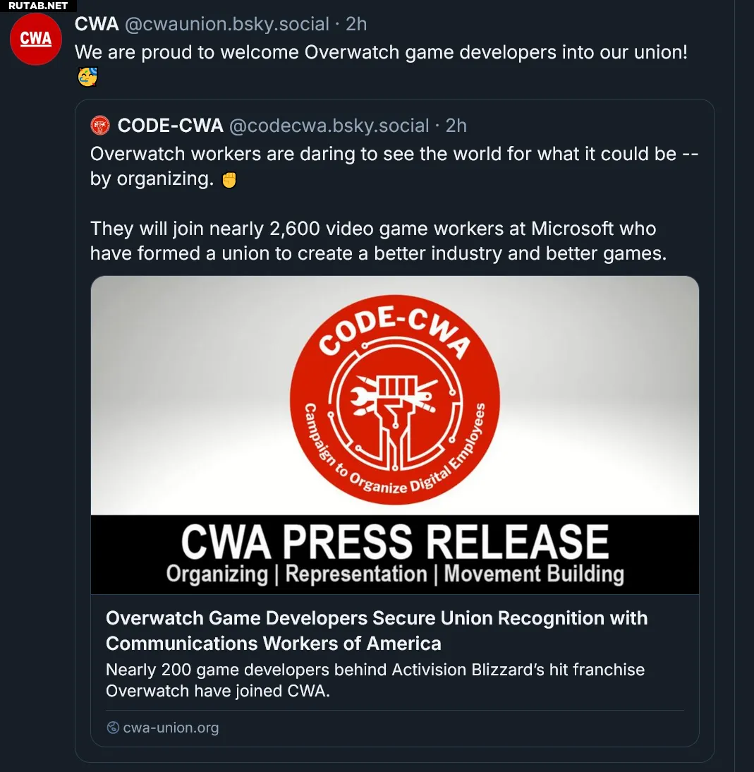 Почти 200 разработчиков Overwatch в Activision Blizzard объединились в новый профсоюз под названием «Overwatch Gamemakers Guild» при поддержке американского профсоюза Communications Workers of America (CWA). В состав организации вошли специалисты из разных областей: дизайнеры, продюсеры, инженеры, художники, звукорежиссеры и тестировщики.