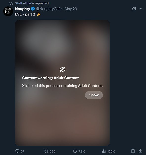 В зависимости от настроек контента в Twitter, изображение либо скрыто предупреждением, либо отображается сразу. Команда Stellar Blade, управляющая аккаунтом с 147 000 подписчиков, ежедневно публикует десятки фанатских работ. Вероятно, администратор не проверил содержимое арта перед репостом или не открыл его полностью — превью скрывало откровенные детали.