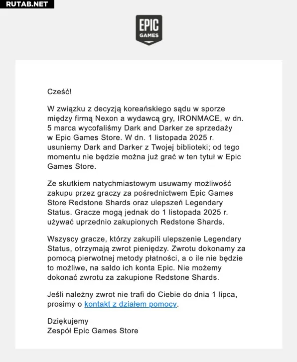 Теперь Epic Games Store объявила, что 1 ноября 2025 года Dark and Darker будет удалена из магазина и библиотек игроков. Пользователи, купившие Legendary-издание, могут рассчитывать на возврат средств. Однако деньги, потраченные на внутриигровую валюту Redstone Shards, возвращены не будут.