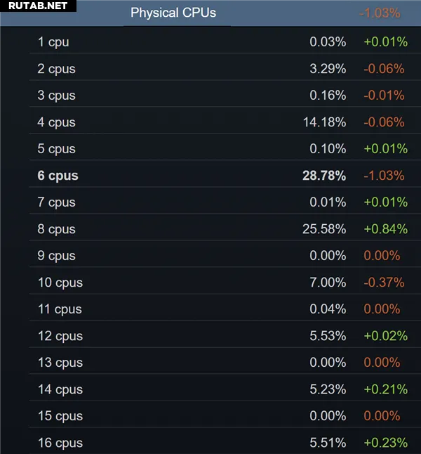 По количеству ядер 6-ядерные процессоры остаются самыми популярными (28,78%), но за месяц потеряли 1,03 пункта. Доля 8-ядерных CPU, напротив, выросла на 0,84 пункта и достигла 25,58%.