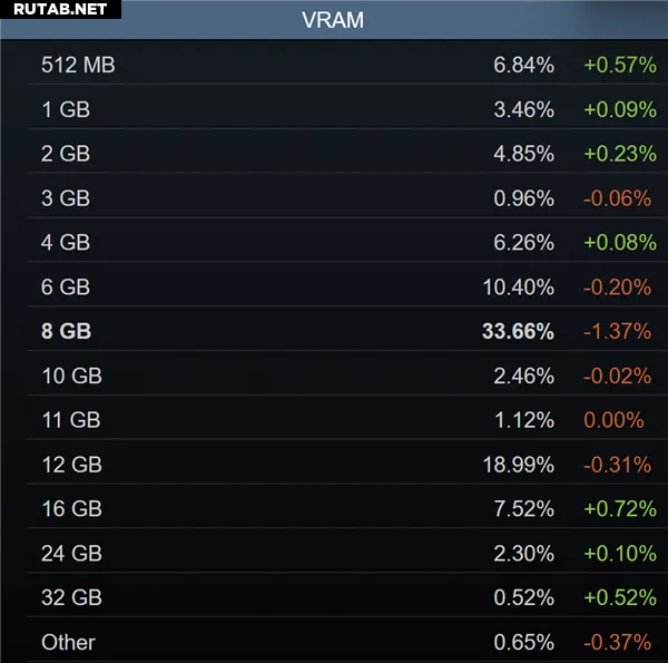 Что касается объёма видеопамяти, конфигурации с 8 ГБ по-прежнему самые распространённые (33,66%), что объясняется большим количеством старых карт на рынке. Однако за месяц их доля сократилась на 1,37 процентных пункта, тогда как доля 16-гигабайтных решений выросла на 0,72 пункта — это рекордный прирост, который позволил им достичь отметки в 7,52%.