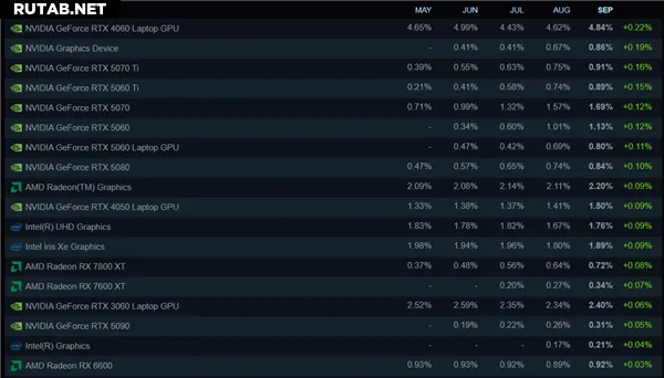 Мобильная версия RTX 5060 также показывает высокие темпы роста, поднявшись до 0,80%, однако до статуса нового лидера ей ещё далеко.