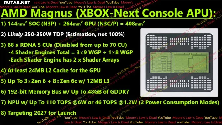 Ранее он сообщал, что процессор для следующего Xbox носит кодовое имя Magnus, имеет 11 ядер на архитектуре Zen 6, графику на RDNA 5, выполнен по 3-нм техпроцессу и включает до 70 вычислительных блоков (CU), из которых могут быть активны 68.