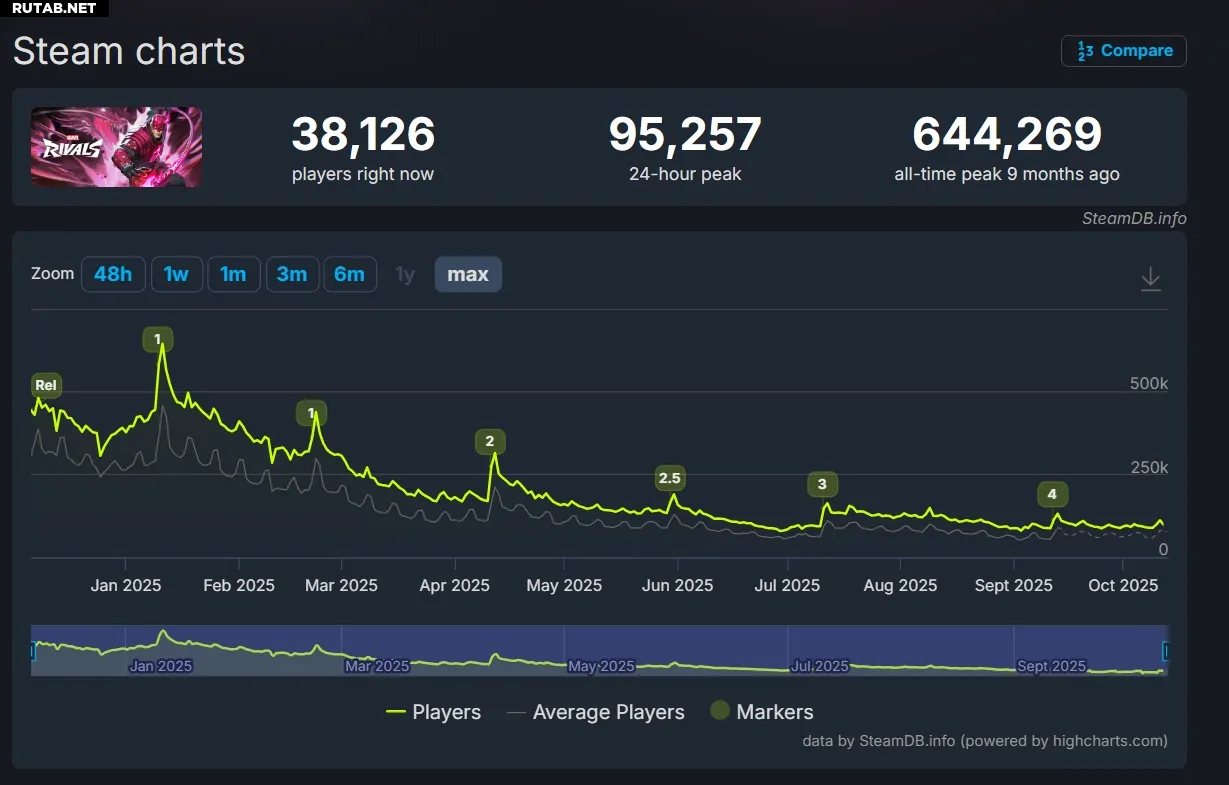 Напомним, релиз Marvel Rivals в Steam состоялся в декабре 2024 года. Тогда пиковый онлайн достиг 480 990 человек. Абсолютный рекорд — 644 269 игроков одновременно — был установлен в январе 2025 года. Таким образом, за менее чем год шутер потерял около 85% своей аудитории.