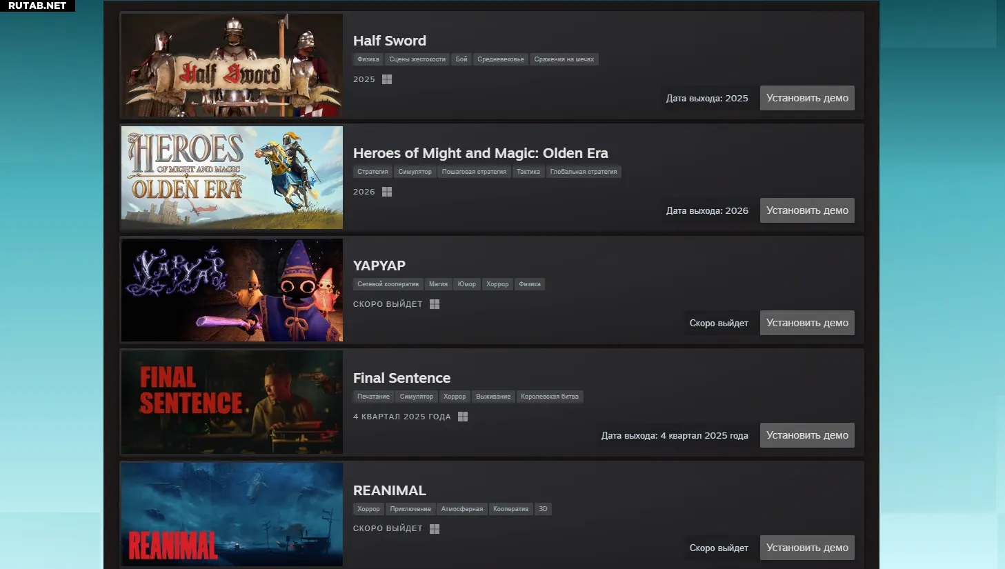 Первое место занял Half Sword — реалистичный средневековый симулятор сражений на мечах. На второй позиции оказалась новая часть культовой серии Heroes of Might and Magic: Olden Era. Тройку лидеров замыкает кооперативный хоррор YAPYAP.