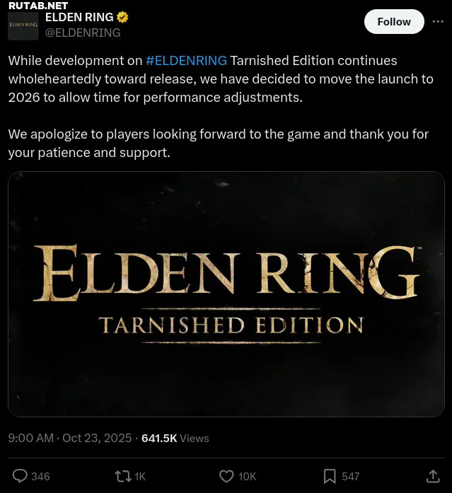 Издание Elden Ring Tarnished Edition, которое разрабатывается эксклюзивно для консоли Nintendo Switch 2, продолжает испытывать проблемы с довольно слабым аппаратным обеспечением портативной консоли. Согласно недавнему заявлению на официальной странице Elden Ring в X, релиз версии для Switch 2 отложен до 2026 года. Разработчики сослались на необходимость «времени для корректировки производительности».