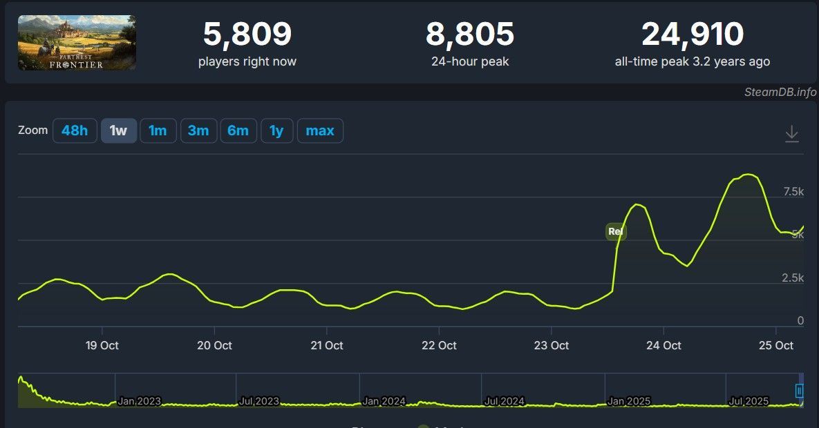 Полная версия Farthest Frontier была очень тепло встречена игроками. В течение двух дней с момента релиза в Steam было оставлено 170 отзывов, 87% из которых — положительные. Игра также отметила заметный рост активности — за последние 24 часа пиковое количество одновременных игроков достигло 8805 человек.