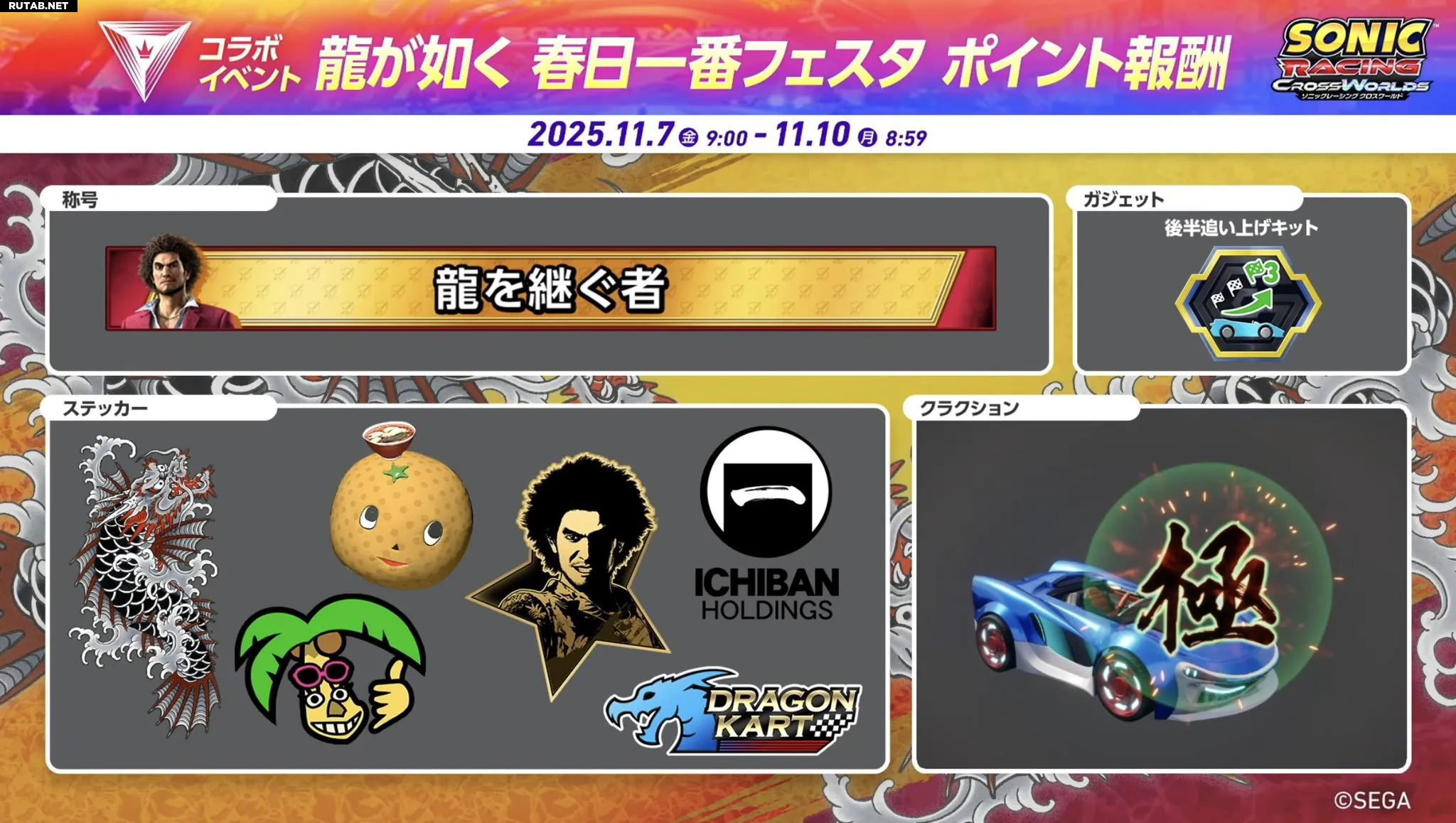 6 ноября в гоночный аркадник войдет Ичибан Косуга — главный герой серии игр Like a Dragon, которая является спин-оффом Yakuza. Персонажа добавят вместе с эффектным болидом в форме головы дракона, а также набором тематических предметов: полоской для профиля, стикерами и другими элементами оформления.