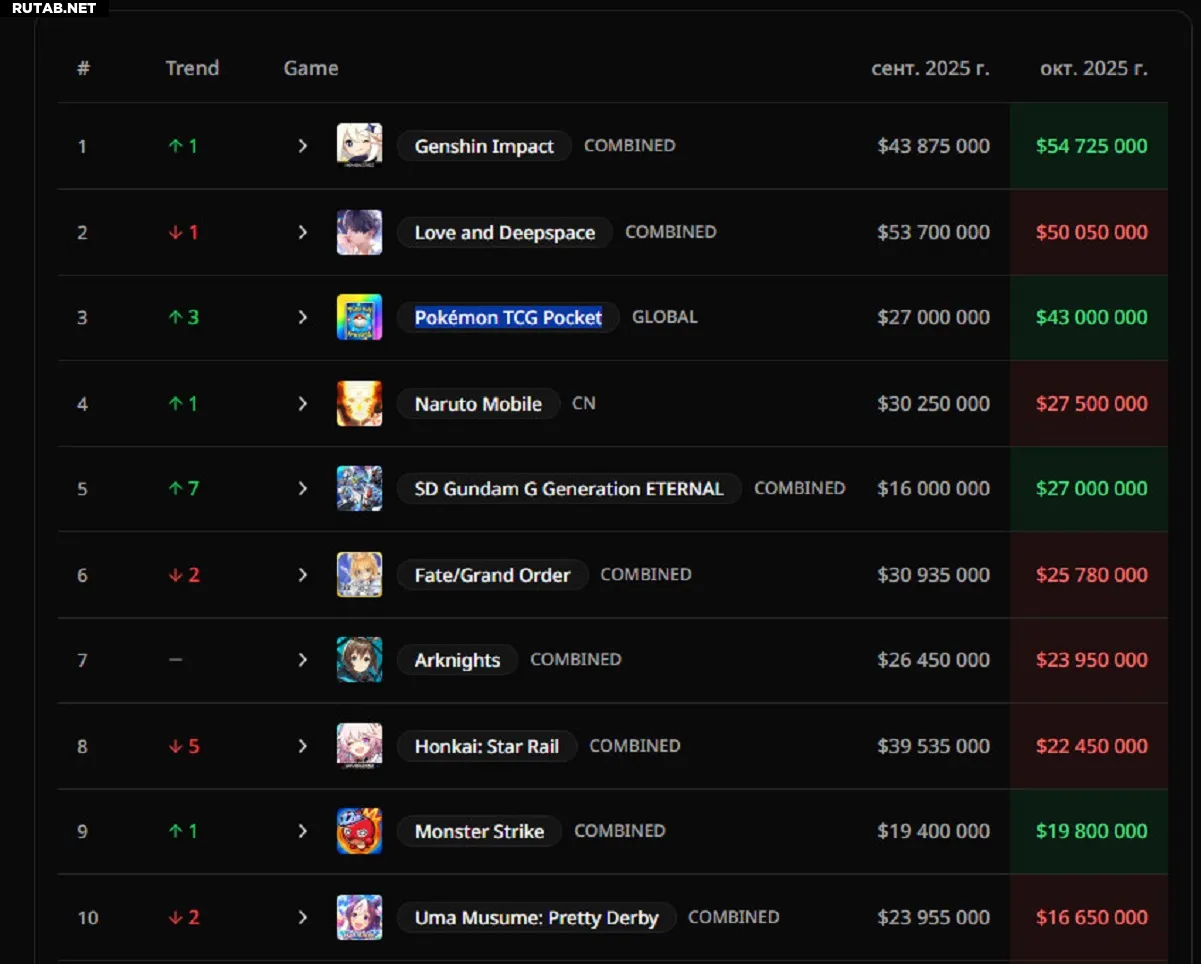 Тройку лидеров замыкает коллекционная карточная игра Pokemon TCG Pocket, которая также показала значительный рост доходов. Если в сентябре игра принесла 27 миллионов долларов, то в октябре этот показатель вырос до 43 миллионов. Остальные игры в топе заработали менее 30 миллионов долларов за месяц.