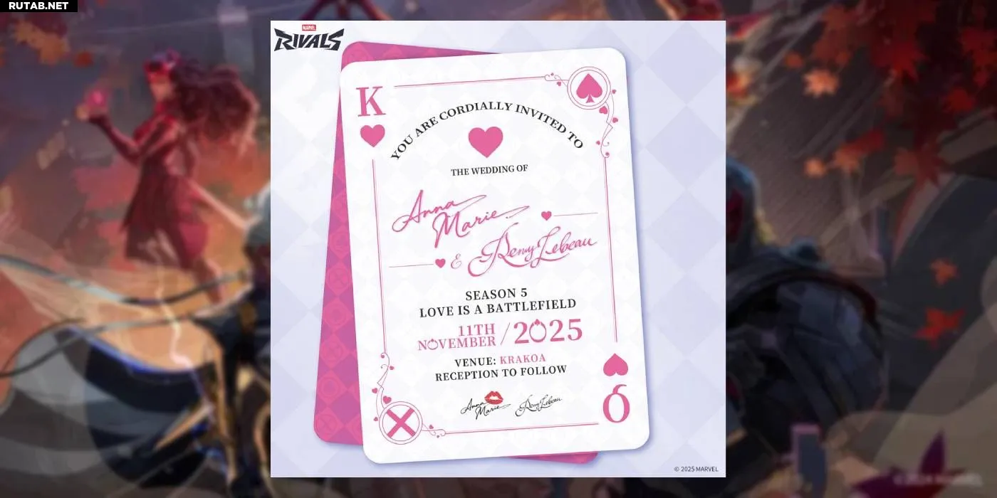 Разработчики шутера Marvel Rivals опубликовали тизер-изображение, которое раскрывает содержание предстоящего пятого сезона игры. На опубликованной в социальной сети X карточке изображено свадебное приглашение для Анны Мари (Роуг) и Реми Лебо (Гэмбит), что подтверждает появление этих персонажей в игре.