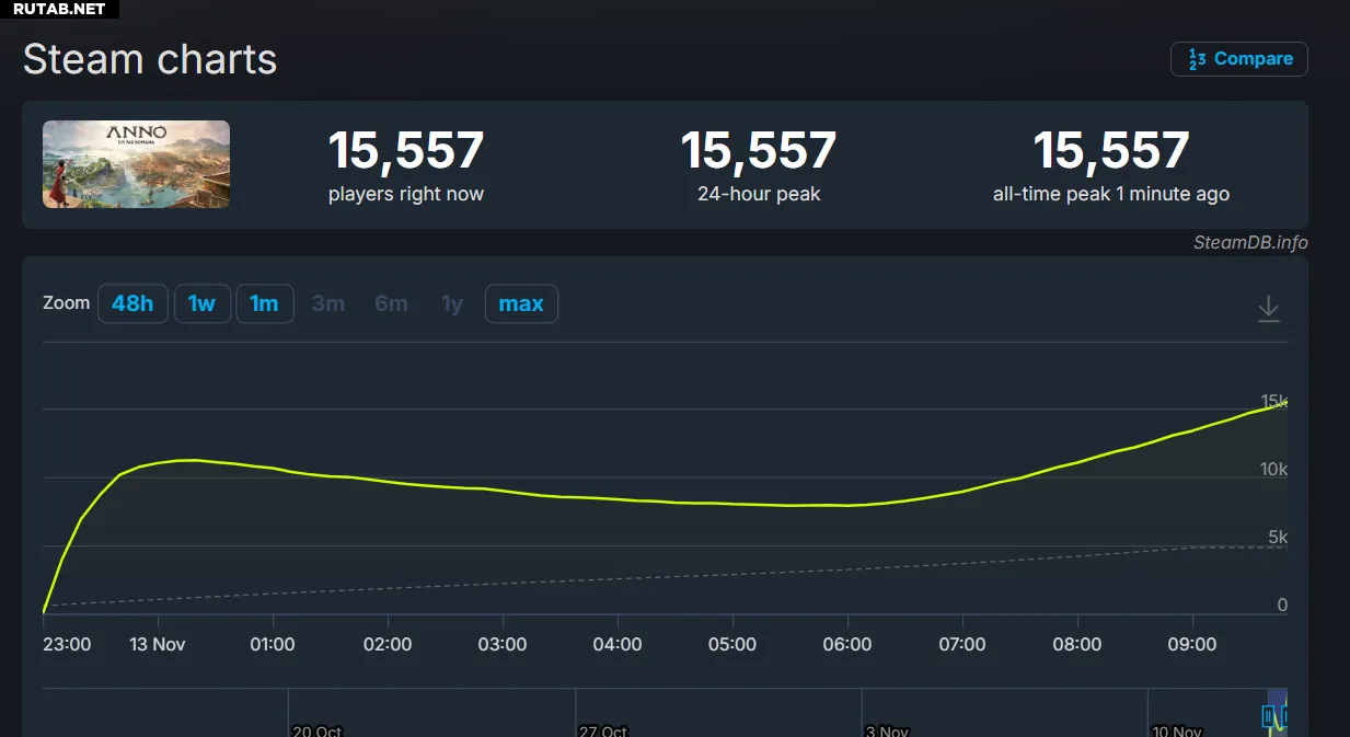 Пиковый онлайн Anno 117: Pax Romana достиг 15 557 игроков одновременно, что является вторым показателем в истории франшизы Anno в Steam. Лидером остаётся Anno 1800 с рекордом в 25 302 одновременных игроков.