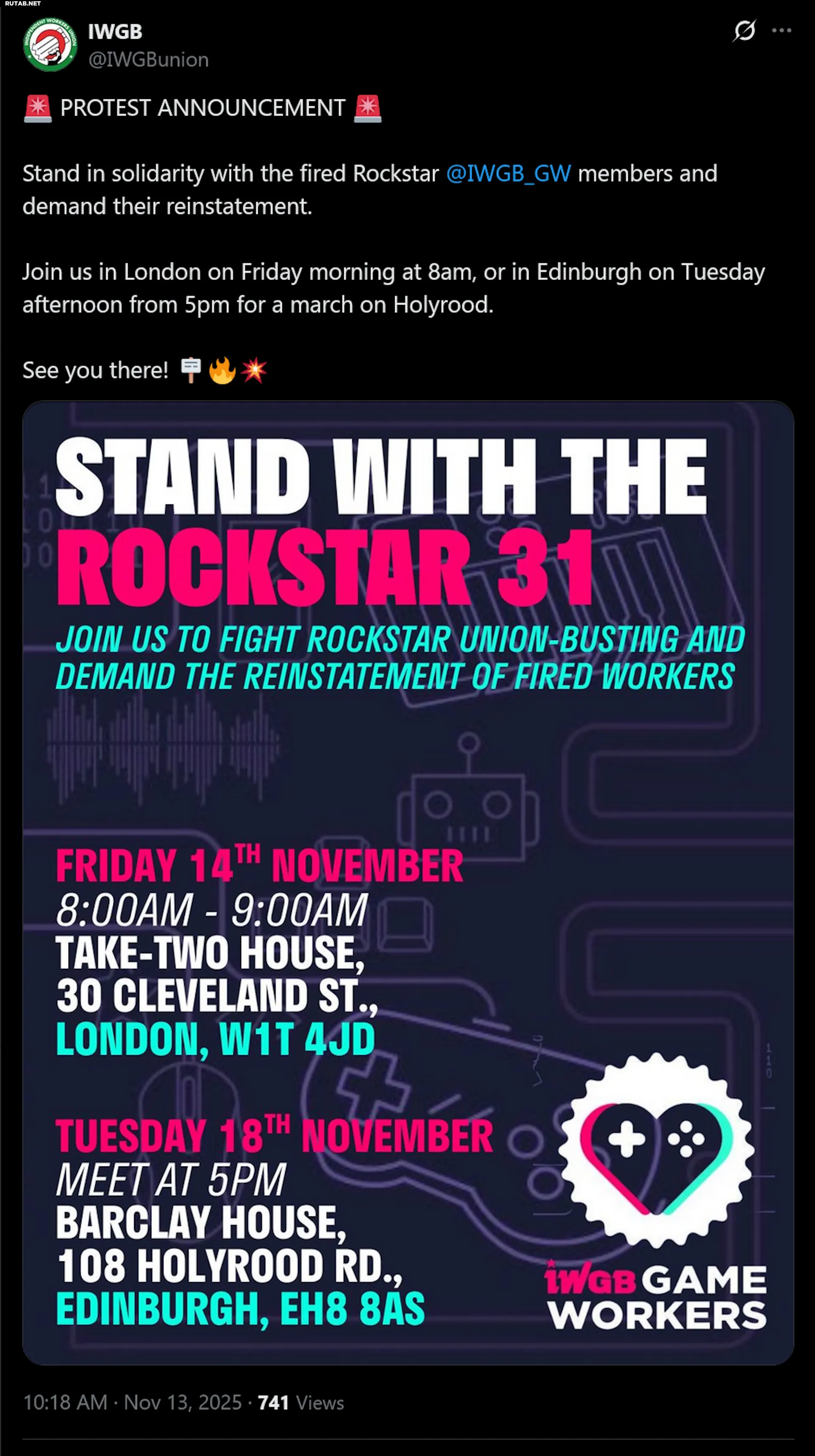 Сотрудники, работавшие в офисах Rockstar в Великобритании и Канаде, были уволены внезапно в конце октября. Rockstar позже заявила, что сотрудники «распространяли и обсуждали конфиденциальную информацию на публичном форуме», но сами уволенные — и профсоюз IWGB — утверждают, что их уволили за попытку организовать профсоюз. IWGB впоследствии сообщил, что усилия по negociации возврата сотрудников были отвергнуты, что привело к подаче искового заявления ранее на этой неделе.