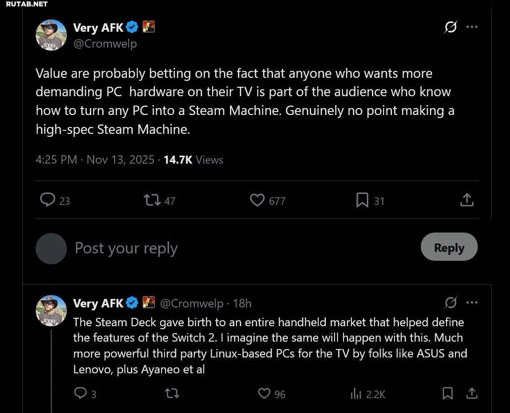 «Valve, вероятно, рассчитывает на то, что те, кому нужно более производительное железо для телевизора, и так знают, как превратить любой ПК в Steam Machine. Создавать высокопроизводительную Steam Machine просто бессмысленно», — написал Дауз на своей странице в X.
