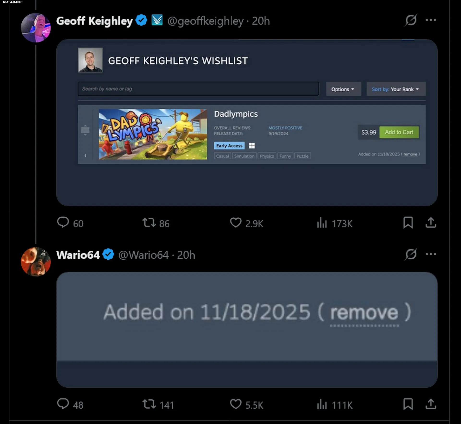 Спустя почти день Кейли решил положить конец слухам и раскрыл правду. Оказалось, что единственная игра в его списке желаний — это мультиплеерная Dadlympics, выпущенная в сентябре 2024 года, где «папины шутки встречаются с хаосом на основе физики».