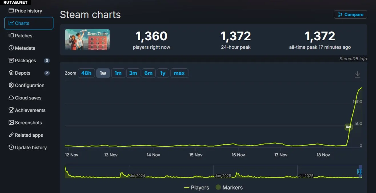 На момент публикации рейтинг News Tower в Steam составляет впечатляющие 96%. При этом пиковое количество одновременных игроков остается довольно скромным — 1372 пользователя, причем свой рекорд онлайн-активности игра обновила буквально несколько минут назад.