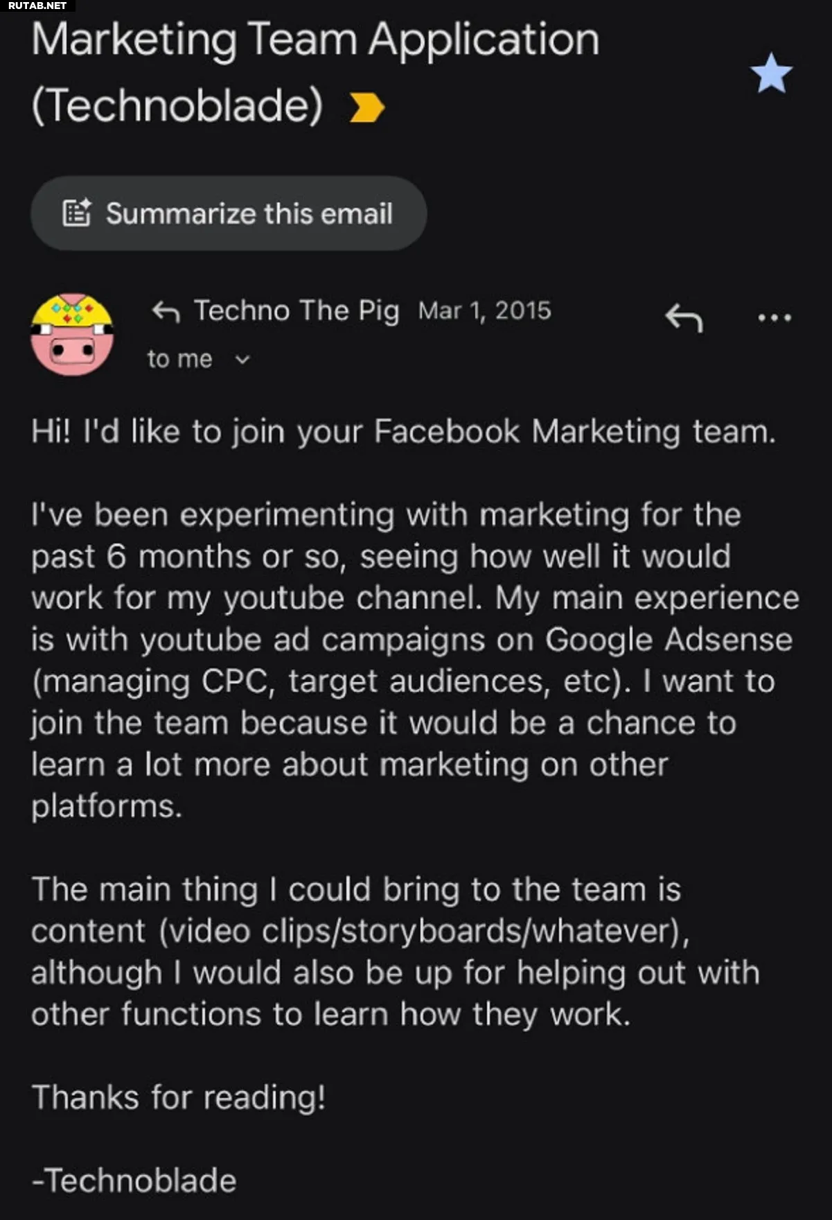 Саймон также поделился интересным историческим фактом, показав письмо, которое Technoblade отправил в Hypixel Studios ещё в 2015 году. Молодой блогер тогда хотел присоединиться к маркетинговой команде сервера Hypixel, но не подошёл по возрасту для официального трудоустройства.