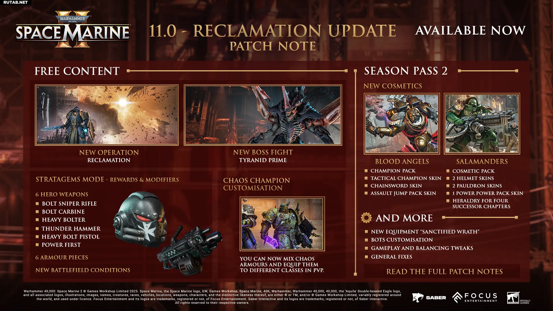 Компания Saber Interactive выпустила масштабное 11-е контентное обновление для игры Warhammer 40,000: Space Marine 2 под названием Reclamation. Главным дополнением стала новая кооперативная операция, в ходе которой игрокам предстоит защищать повреждённый крейсер на орбите от полчищ тиранидов. Особенностью миссии является динамическое изменение задач по мере прохождения.