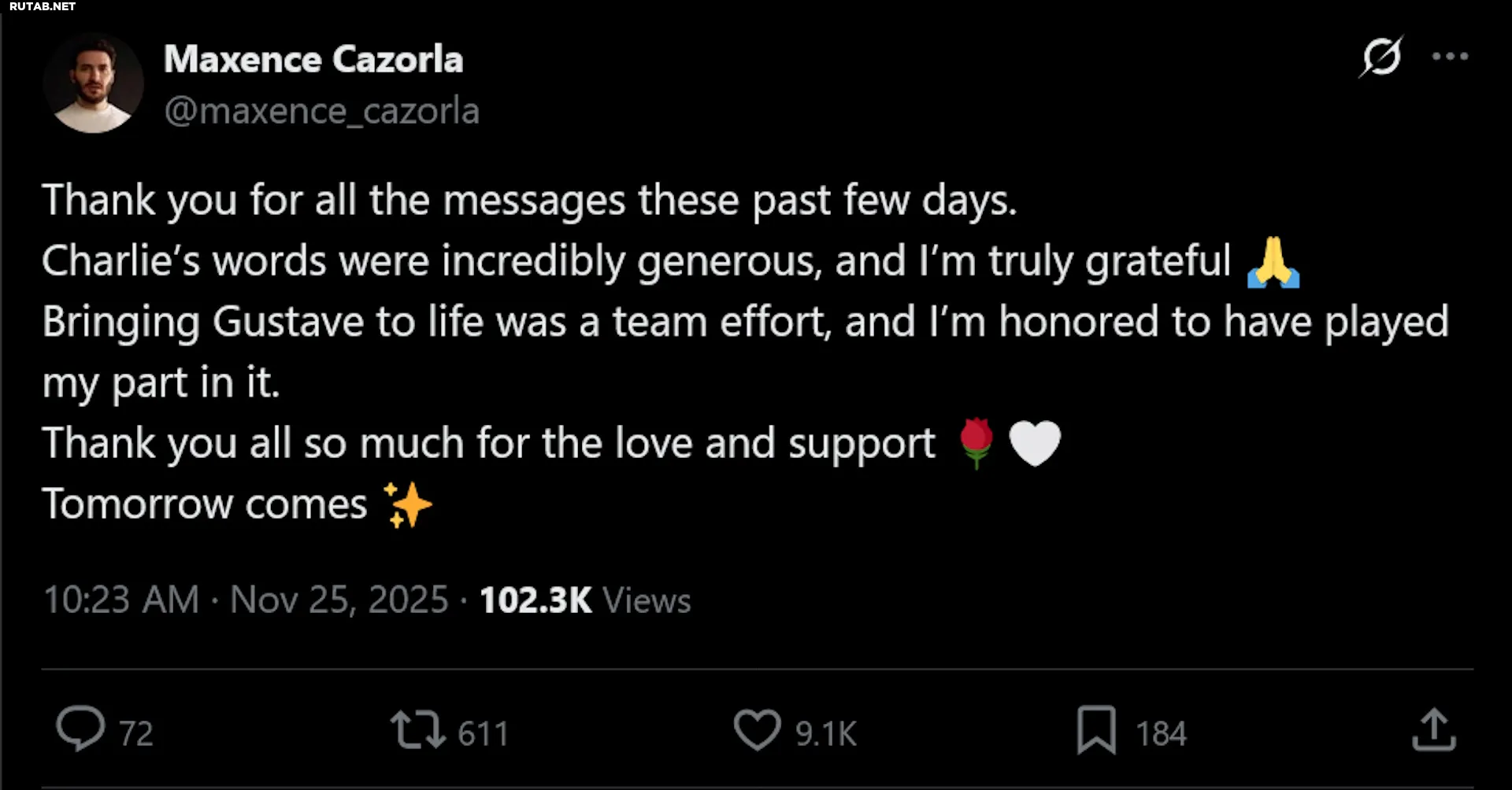 «Спасибо за все сообщения за последние несколько дней, — написал Касорла в X (через GamesRadar) вскоре после того, как стали известны комментарии Кокса. — Слова Чарли были невероятно щедрыми, и я искренне благодарен. Оживление Гюстава было командной работой, и для меня честь сыграть в ней свою роль. Большое спасибо всем за любовь и поддержку».