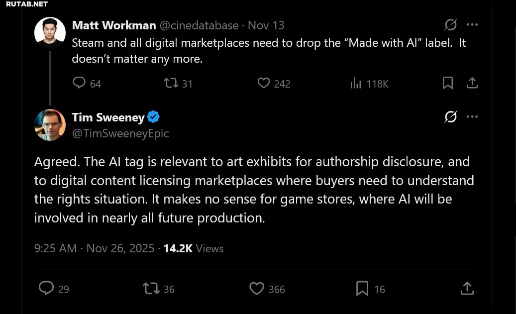 На многих страницах игр в Steam, например у Arc Raiders, можно увидеть довольно заметное предупреждение «Раскрытие информации о контенте, созданном ИИ», которое поясняет, какие части игры используют контент, сгенерированный искусственным интеллектом. Однако в Epic Games Store подобных пометок нет. И эта разница вряд ли изменится по простой причине: глава Epic Тим Суини считает раскрытие информации об ИИ пустой тратой времени.