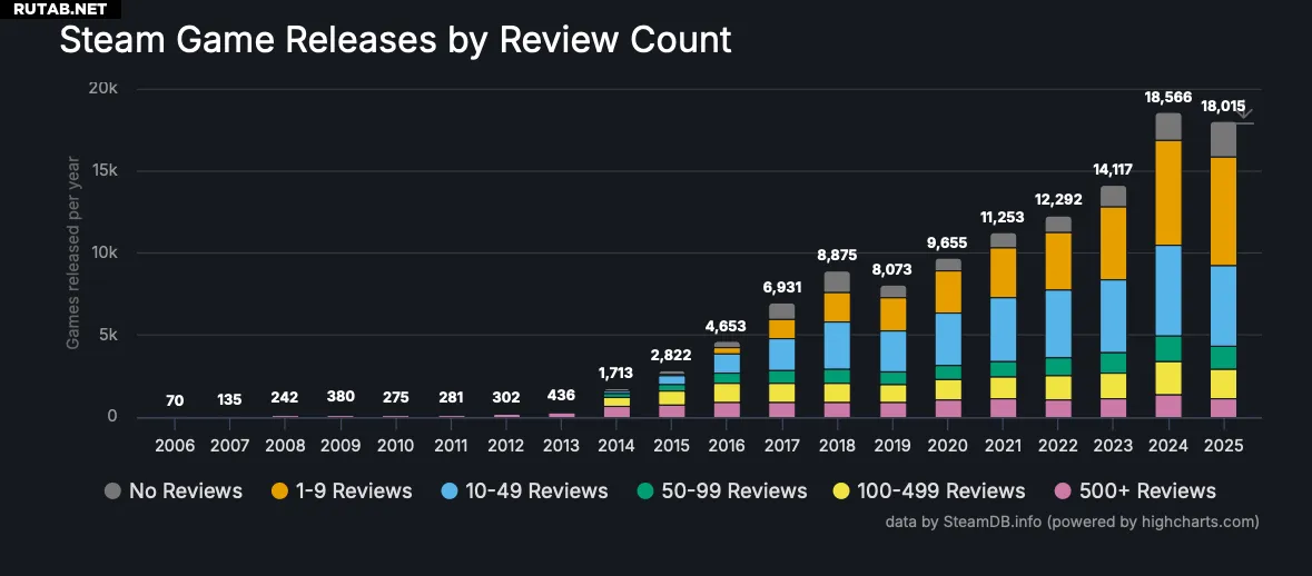 В 2025 году на платформе Steam было выпущено 17 905 игр, при этом половина из них собрала менее 10 отзывов. Такие данные приводит сервис SteamDB.
