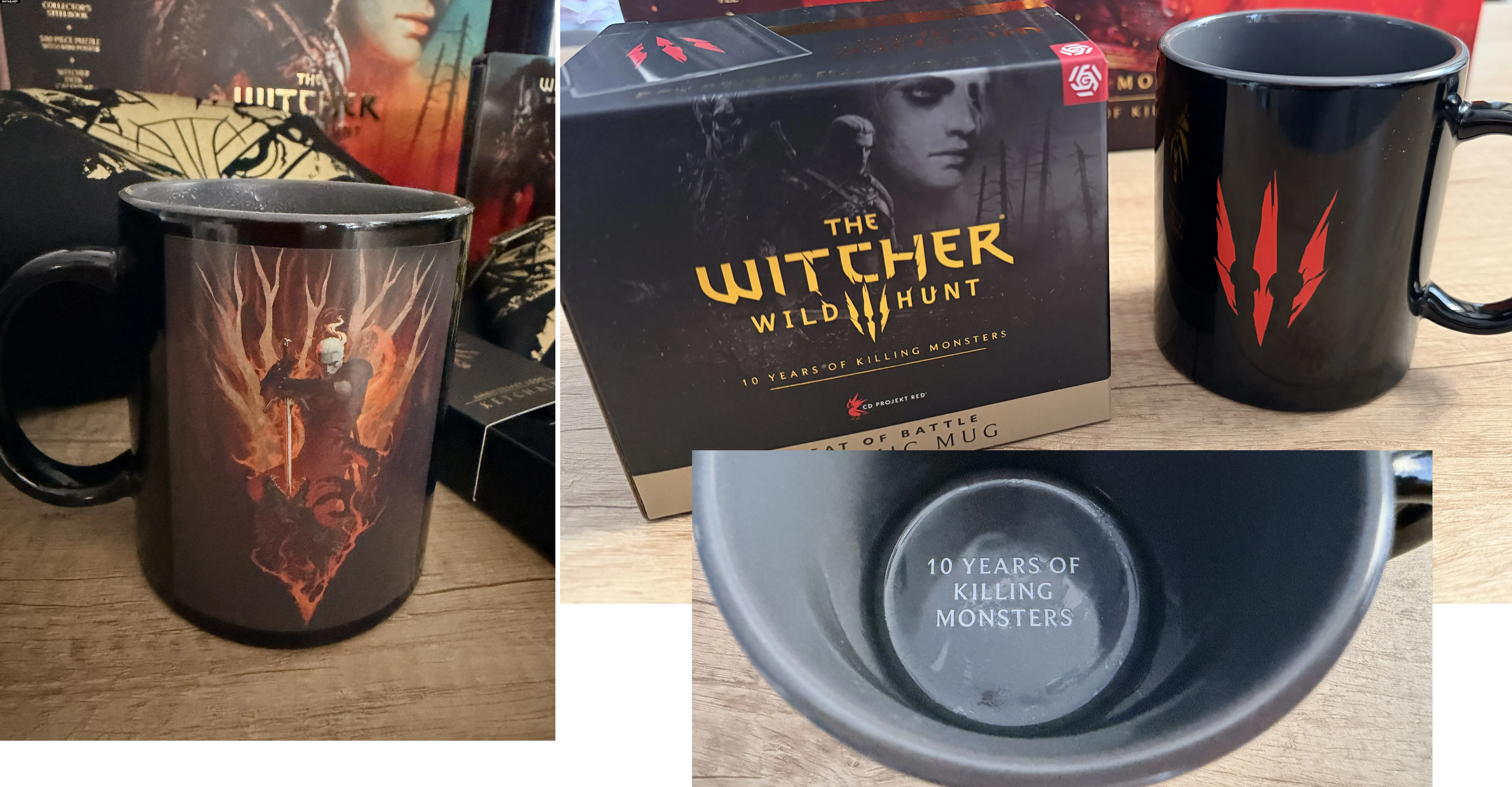 Термоактивная кружка меняет изображение при наливании горячего напитка — появляется скрытая графика с Геральтом. На дне кружки имеется надпись «Десять лет убийства монстров».