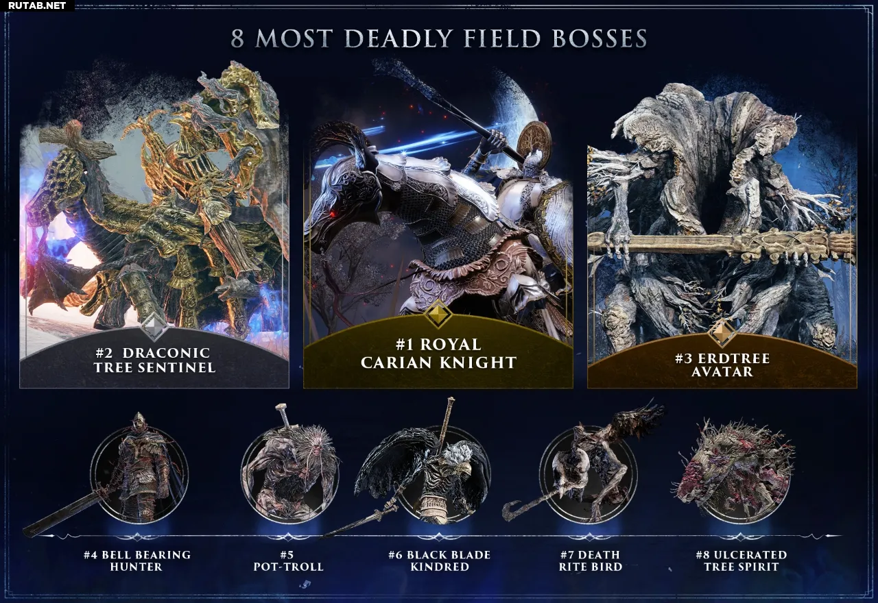 Драконий Древний Страж — это просто грубая сила. Что касается Карианского Рыцаря (Лоретты из базовой игры), то она, безусловно, сложный противник, но предсказать её лидерство было трудно. На пятом месте расположились защищающие замок Горшковые Тролли — ещё одни всеобщие «любимцы».