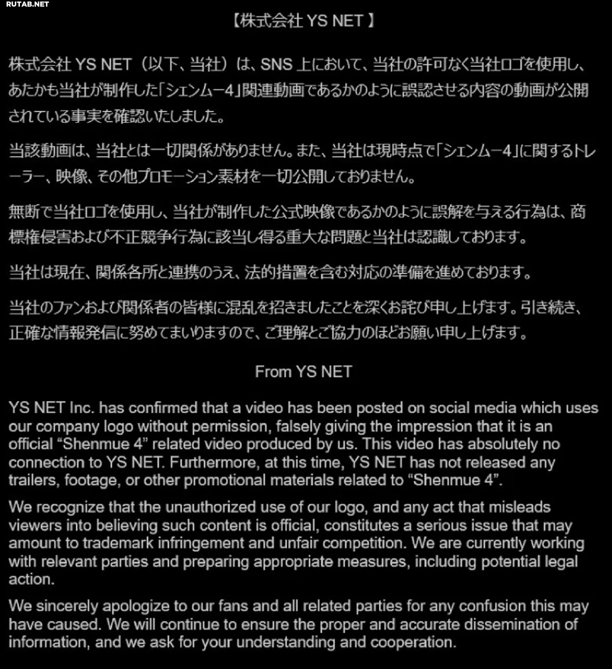 Студия YS Net, создавшая культовую серию Shenmue, официально отреагировала на фейковый трейлер, который выдавался за анонс Shenmue 4. Разработчики разгневаны несанкционированным использованием их логотипа, что создало «ложное впечатление» подлинности у фанатов.