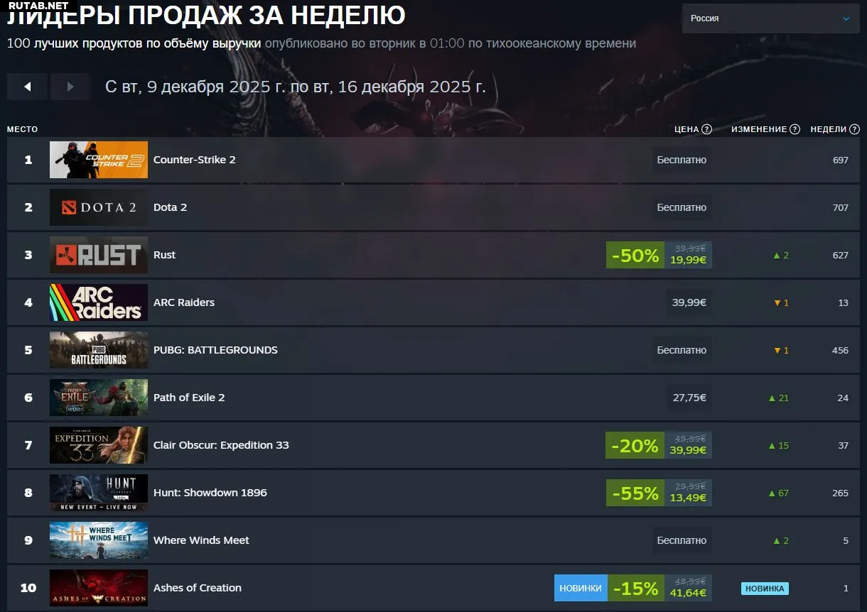 В российском сегменте магазина также произошли изменения. Игра Rust поднялась на две позиции, сместив ARC Raiders с третьего места. Значительно укрепили свои позиции Clair Obscur: Expedition 33 и долгожданная Path of Exile 2.