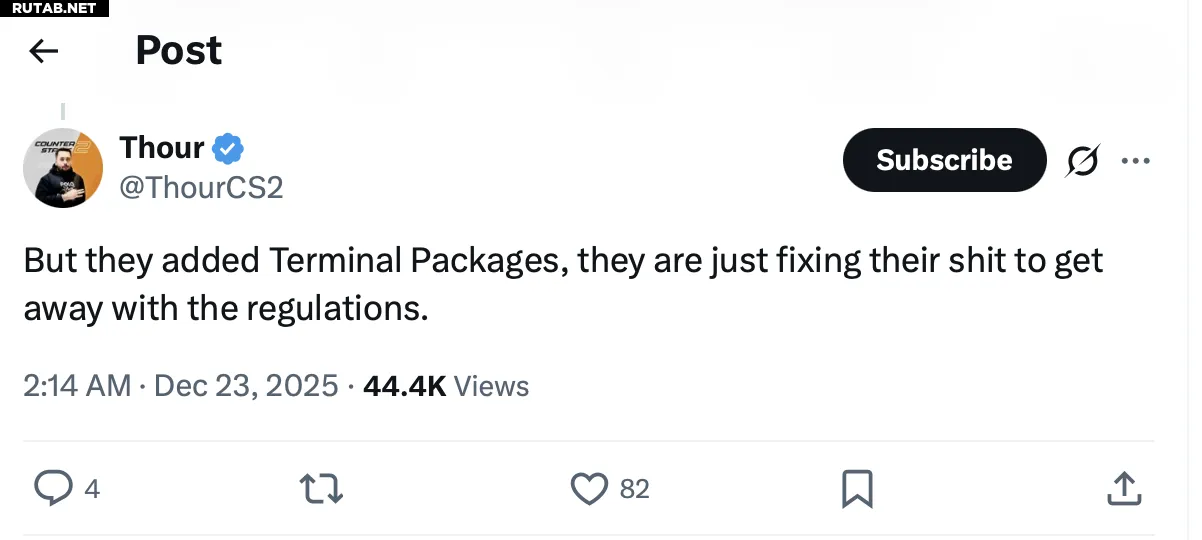Thour считает, что главной причиной такого шага стало давление регуляторов и многочисленные жалобы сообщества на то, что CS2 превратилась в «симулятор азартных игр». Новая система «терминалов» призвана легализовать получение предметов в странах с жёстким антигемблинговым законодательством, формально уйдя от статуса лутбоксов.