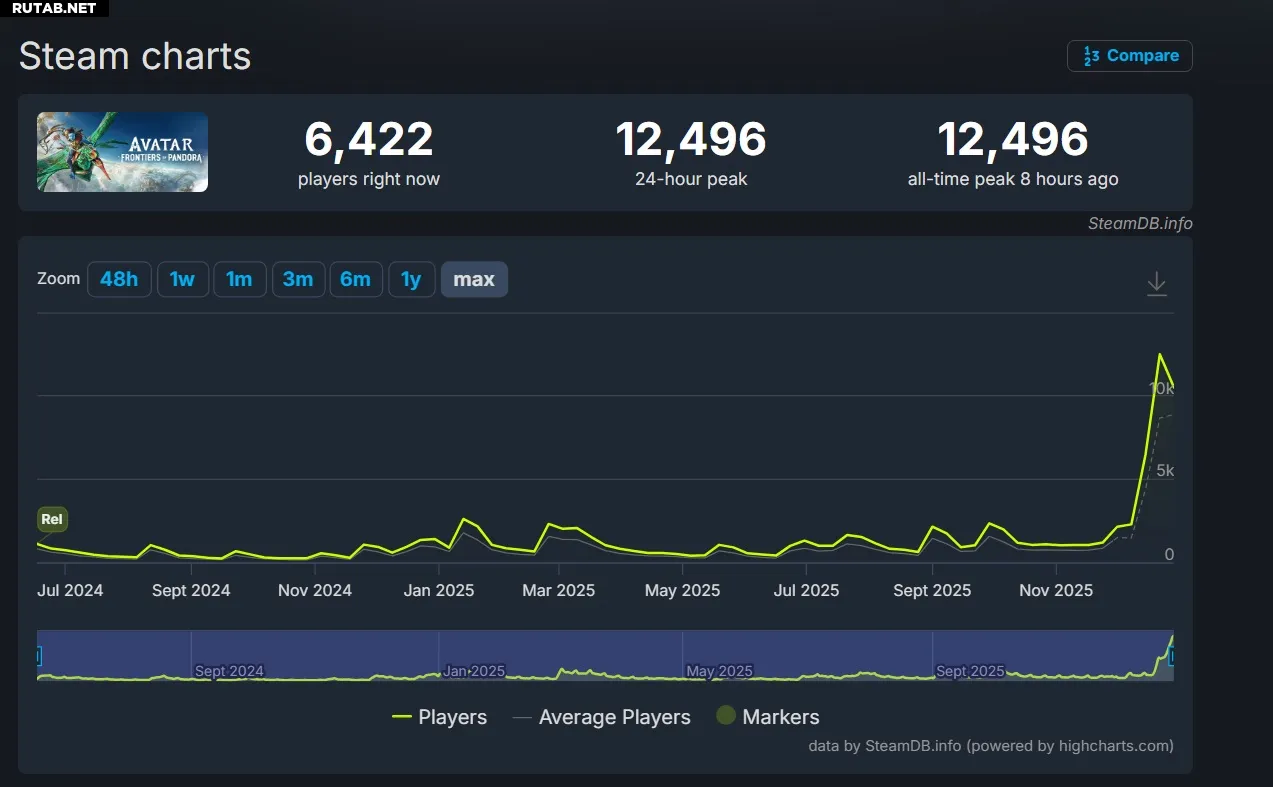 Игра Avatar: Frontiers of Pandora, вышедшая в конце 2023 года, неожиданно обновила свой пиковый онлайн в Steam. В минувшие выходные в неё одновременно играли 12 496 человек, что почти в пять раз превышает предыдущий рекорд в 2,6 тысячи игроков, установленный в январе 2025 года.
