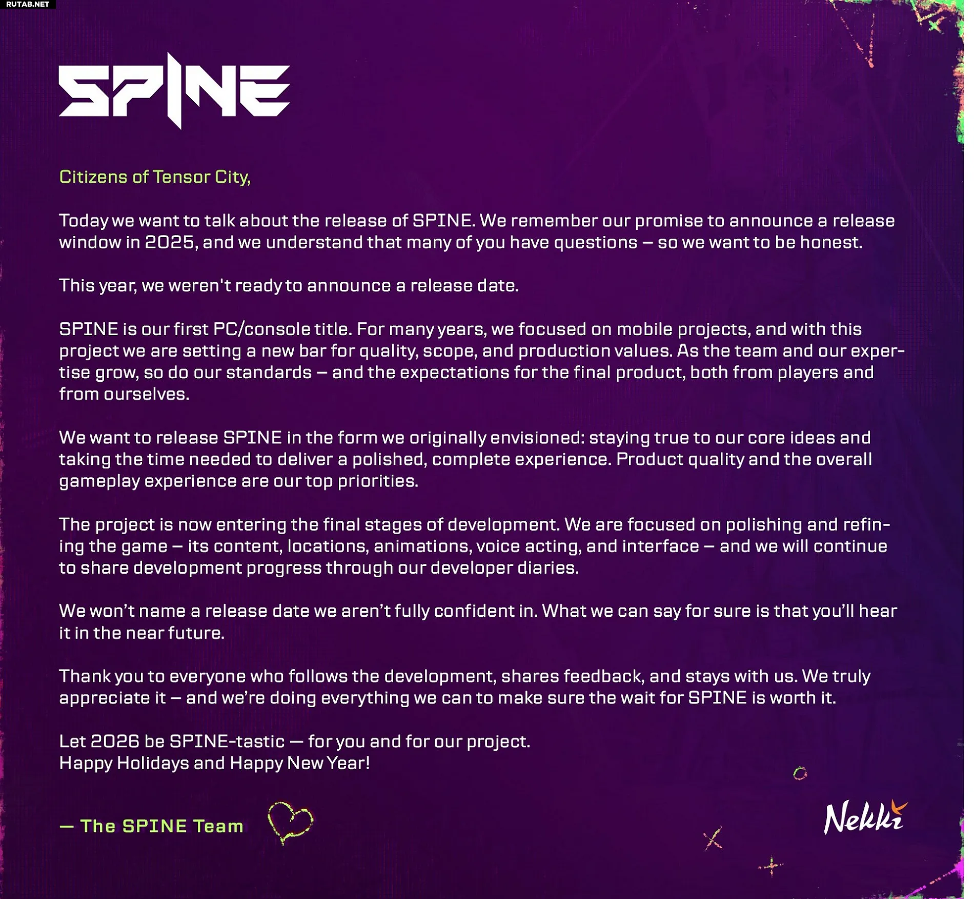 Студия Nekki, известная своими мобильными проектами, официально извинилась перед фанатами за то, что не смогла объявить дату релиза своего амбициозного экшена Spine в 2025 году, как обещала ранее.