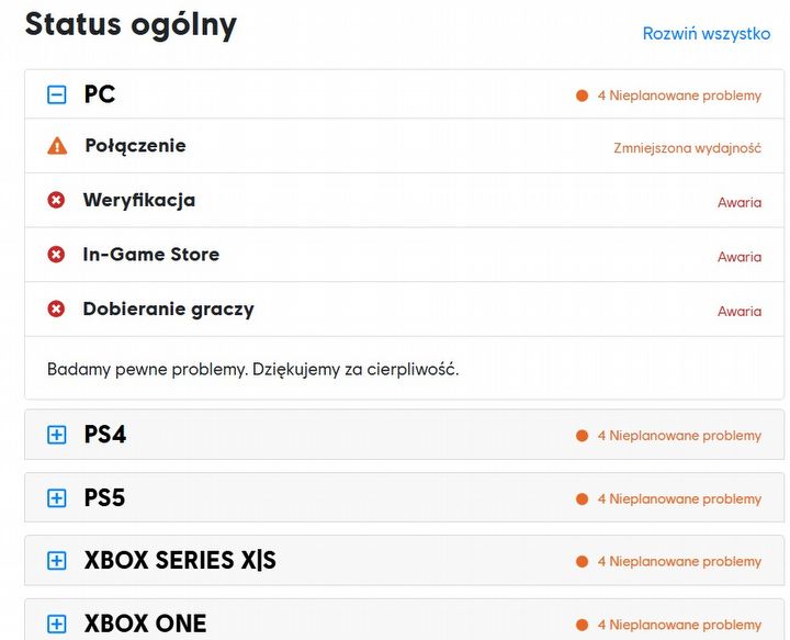 Студия продолжает бороться с проблемами, что подтверждает «статус службы» на её официальном сайте. В настоящее время на всех платформах, где вышла игра (PC, PS4, PS5, XSX/S и Xbox One), наблюдаются одни и те же неполадки, связанные со сниженным качеством соединения, сбоями при верификации, во внутриигровом магазине и упомянутом подборе игроков.