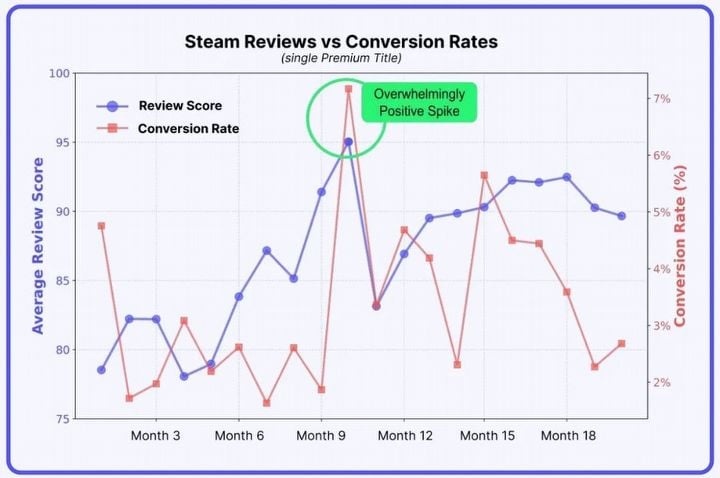 Для наглядности Gamesight использовала конкретный тайтл, чья маркетинговая кампания длилась 21 месяц. На графике виден рост конверсии на 10-м месяце, когда игра достигла «крайне положительных» оценок после добавления «ожидаемой игроками» функции. Аналогичные закономерности наблюдались и у других проектов.