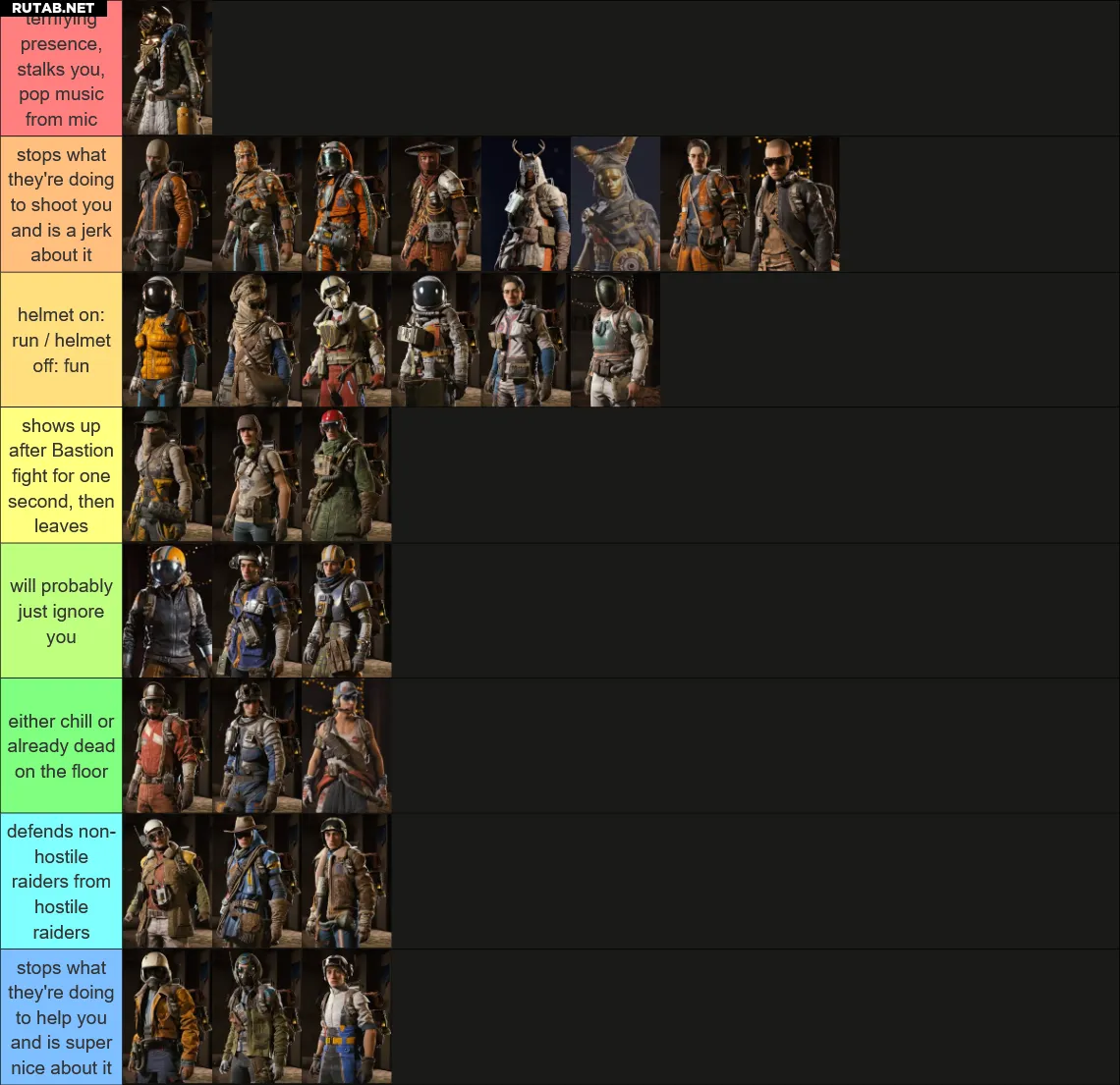 «Хотел составить диаграмму на основе своего опыта, так как тоже заметил закономерности в поведении в зависимости от облика, основываясь на этом посте», — написал abeetabee, подчеркнув, что это не истина в последней инстанции для каждого игрока. В его тир-лист вошли 30 скинов, которые он встречал достаточно часто, чтобы дать оценку.