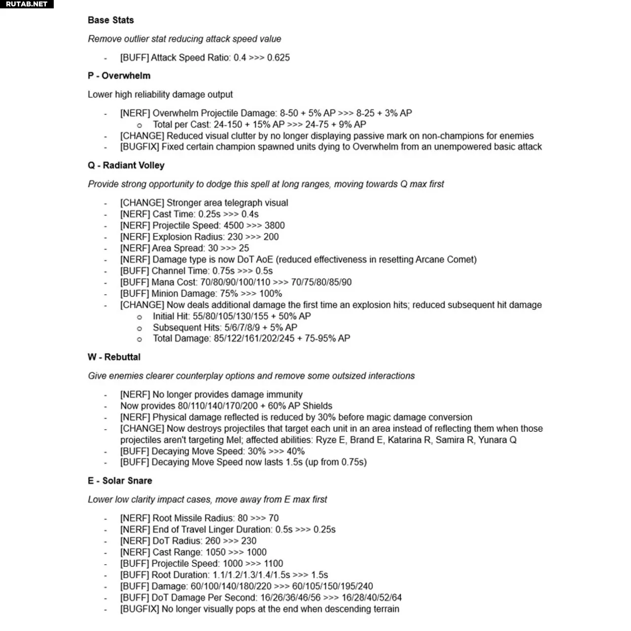 - Пассивное умение: Снижен базовый урон и его масштабирование от AP. Визуальные эффекты убраны с не-чемпионских целей для уменьшения «визуального шума» на поле боя.