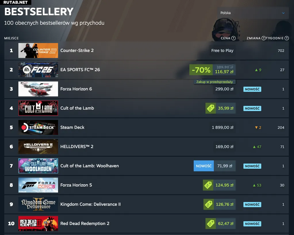 В момент анонса игра даже ворвалась в ТОП-2, и хотя сейчас она немного опустилась, она по-прежнему держит отличные результаты. В России Forza Horizon 6 является третьей самой покупаемой игрой в Steam, а впереди неё стоят лишь настоящие продажные монстры: Counter-Strike 2 и EA Sports FC 26.