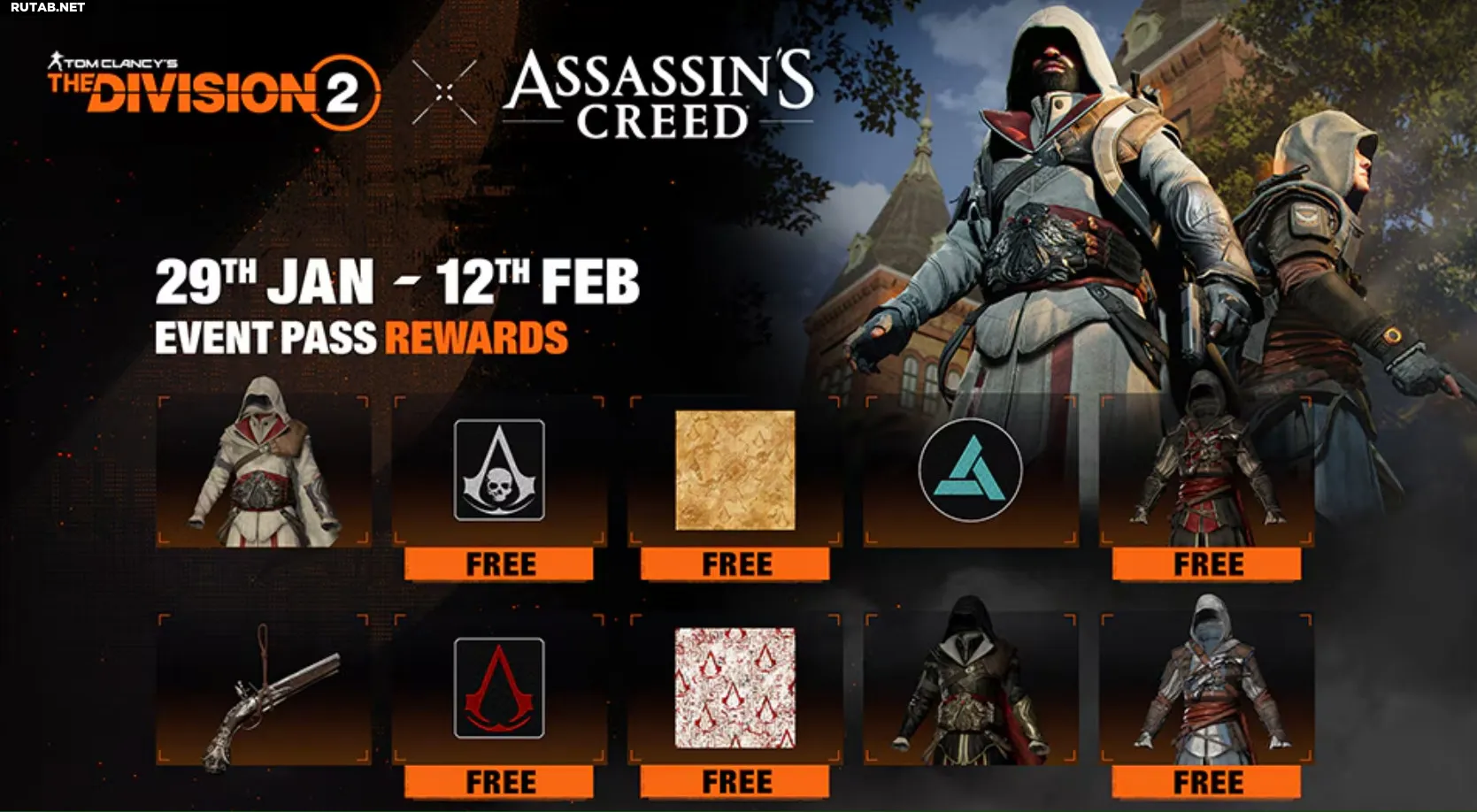 С 29 января по 12 февраля в онлайн-шутере The Division 2 пройдёт специальное событие, посвящённое серии Assassin’s Creed. Игроков ждёт пропуск с двумя треками наград, наполненный тематическими предметами по мотивам франшизы Ubisoft. Часть контента, включая скины для оружия и нашивки, можно будет получить бесплатно.