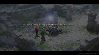 — Как только вы выполните загадочную просьбу статуи и вернётесь в святилище, его запечатанные ворота откроются! Марибель, которая последовала за вами, присоединяется к команде, и вы втроём шагаете внутрь...