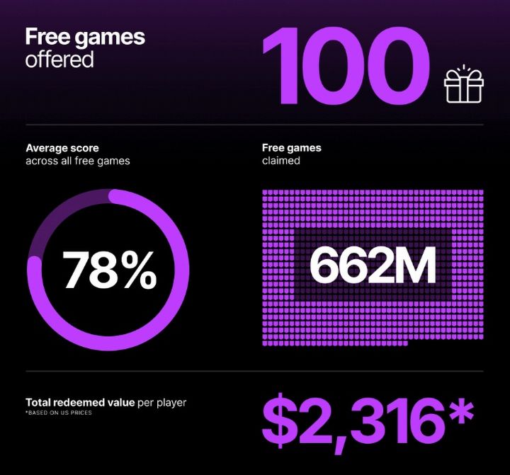 Epic Games в общей сложности раздала бесплатно 100 игр (компания, судя по всему, учитывает здесь также наборы предметов для free-to-play проектов, так как в 2025 году она подарила фанатам 92 игры в прямом смысле), которые игроки забрали около 662 миллионов раз. Если бы пользователь забрал все эти бесплатные тайтлы, он сэкономил бы целых 2316 долларов (около 185 000 рублей). Стоит добавить, что магазин преодолел отметку в 6000 игр, доступных в каталоге.