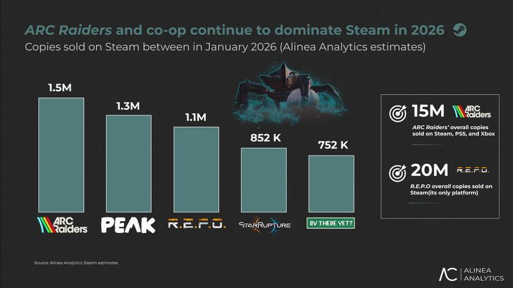Согласно данным Alinea Analytics, ARC Raiders в настоящее время является одним из крупнейших хитов индустрии. Проект Embark Studios был самой продаваемой игрой на Steam, PlayStation и Xbox третий месяц подряд, а в январе 2026 года было продано 1,5 млн копий в Steam и 1,7 млн экземпляров на консолях. Общий объем продаж игры, по оценкам, достиг около 15 млн копий, что принесло более 500 млн долларов дохода (около 40 млрд рублей).