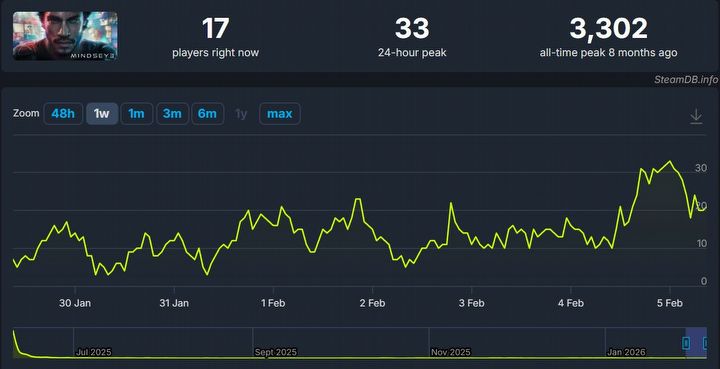 И вот в чём парадокс: несмотря на усердную работу разработчиков, интерес к игре крайне низок. Согласно данным SteamDB, за последние 24 часа пиковое количество одновременных игроков составило всего 33 человека. И это сразу после выхода «крупнейшего» на данный момент обновления.